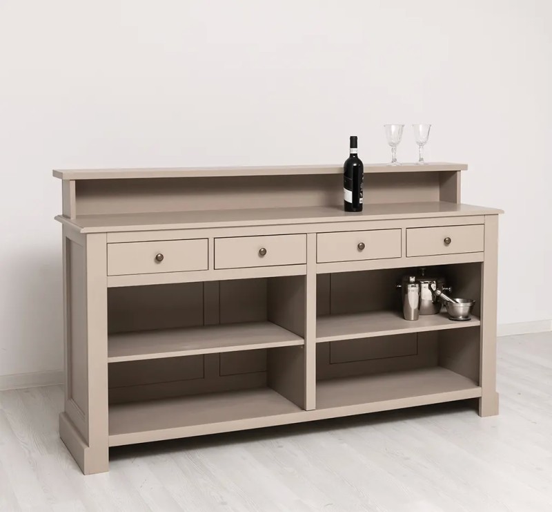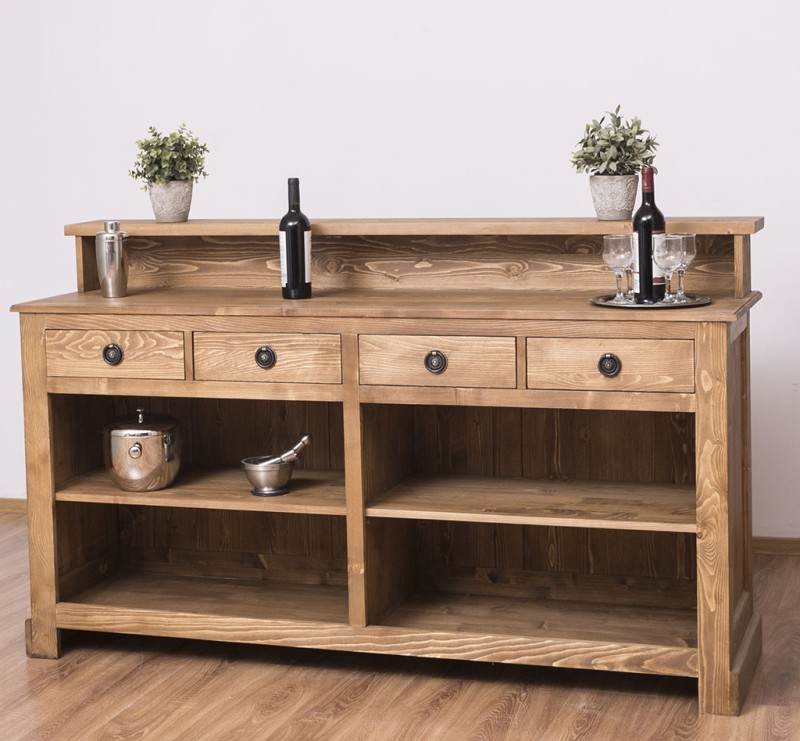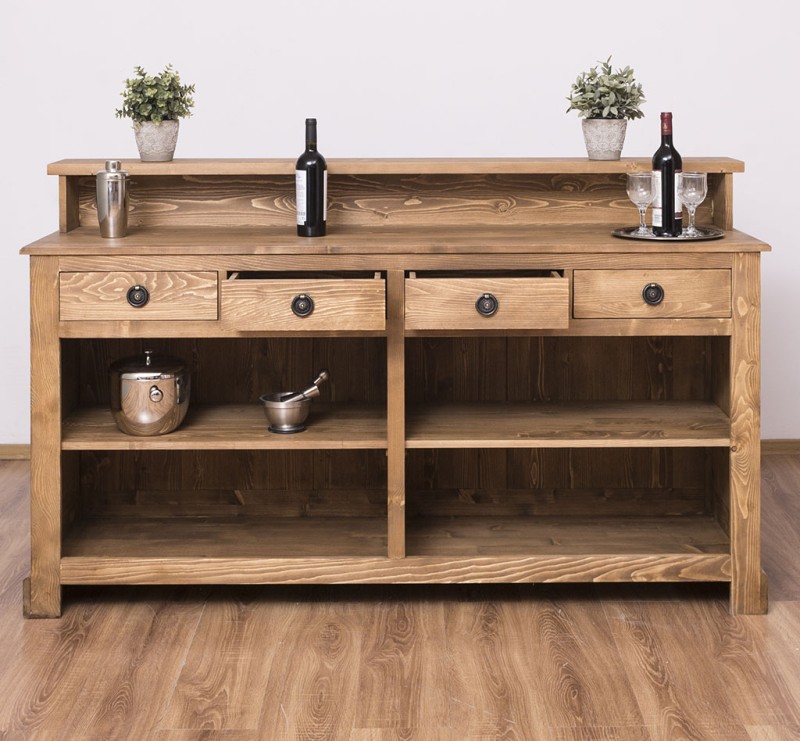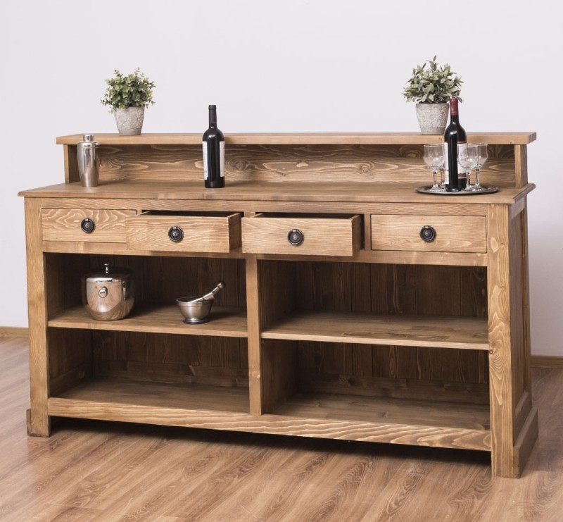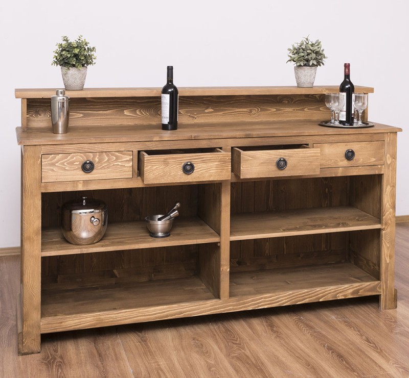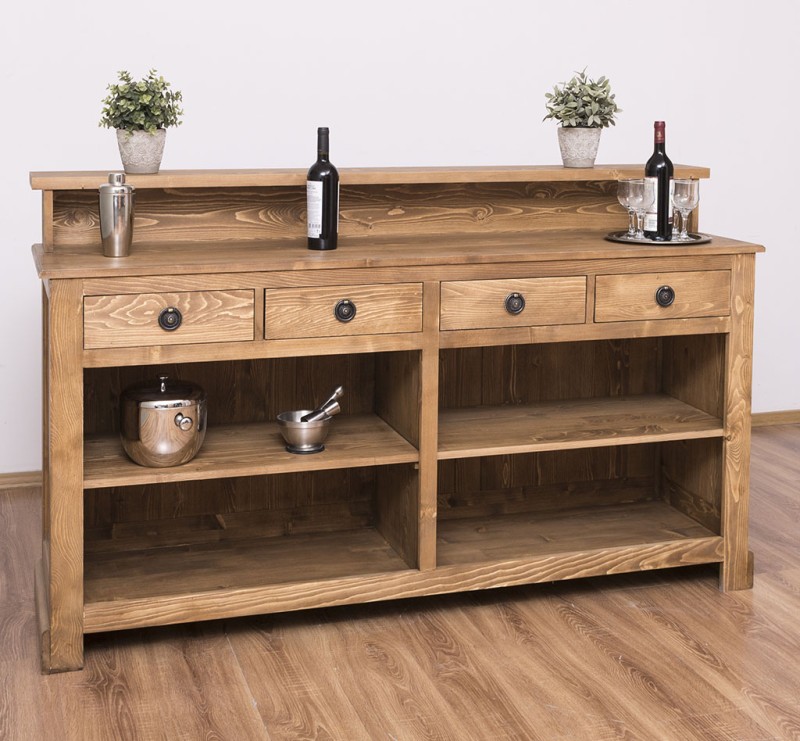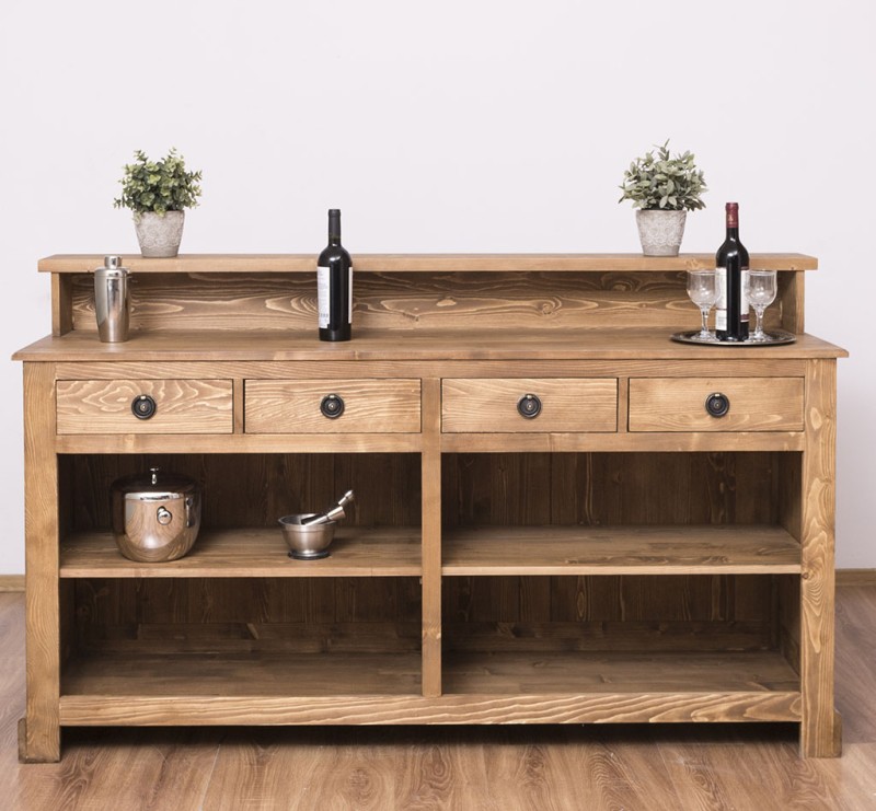 Bar cu 4 sertare, 4 compartimente deschise face parte din categoria Bar si tejghea si este fabricat in Romania din 100% lemn masiv de brad. Cu siguranta veti aprecia calitatea lemnului masiv 100%, vopseaua ecologica pe baza de apa, blaturile tratate cu lac protector, articolele livrate gata asamblate iar constructia foarte solida este garantia pentru o utilizare pe o durata foarte lunga de timp! Articolul poate fi comandat atat cu blat din lemn masiv de brad cat si din lemn masiv de stejar sau cu blat zincat pentru o suprafata si mai resistenta la umezeala si alti factori externi! Produsul ofera spatiu de prezentare generos si practic impartit de doua rafturi fixe avand astfel 4 compartimente deschise, precum si patru sertare, specific mobilierelor din categoria de baruri si tejghele.