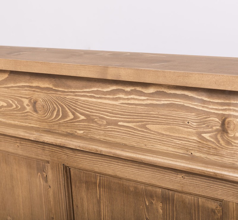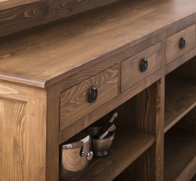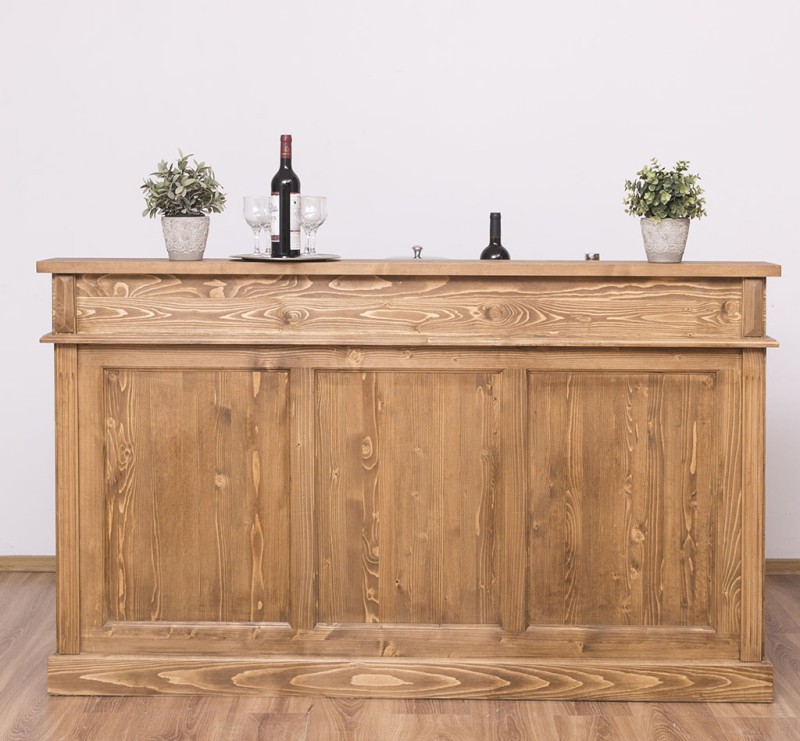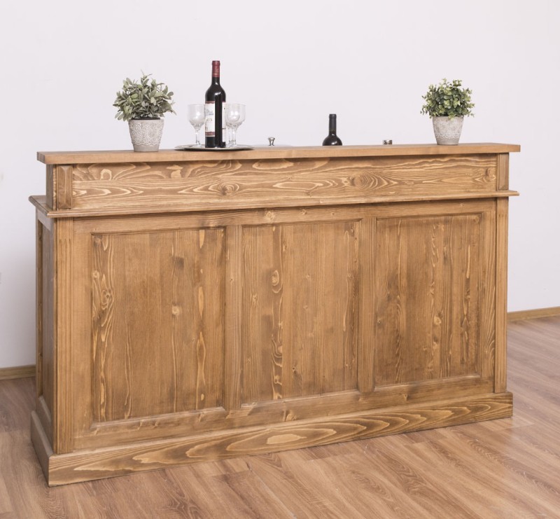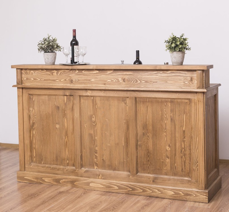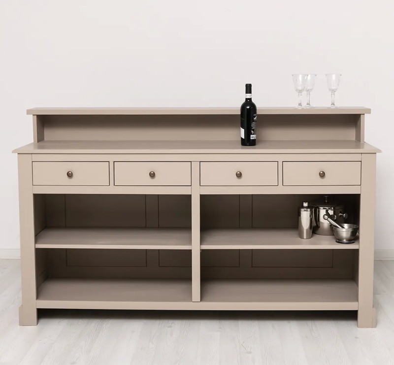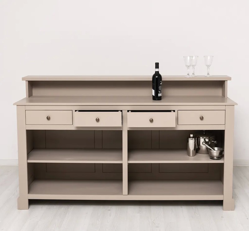 Bar cu 4 sertare, 4 compartimente deschise face parte din categoria Bar si tejghea si este fabricat in Romania din 100% lemn masiv de brad. Cu siguranta veti aprecia calitatea lemnului masiv 100%, vopseaua ecologica pe baza de apa, blaturile tratate cu lac protector, articolele livrate gata asamblate iar constructia foarte solida este garantia pentru o utilizare pe o durata foarte lunga de timp! Articolul poate fi comandat atat cu blat din lemn masiv de brad cat si din lemn masiv de stejar sau cu blat zincat pentru o suprafata si mai resistenta la umezeala si alti factori externi! Produsul ofera spatiu de prezentare generos si practic impartit de doua rafturi fixe avand astfel 4 compartimente deschise, precum si patru sertare, specific mobilierelor din categoria de baruri si tejghele.