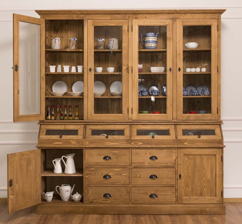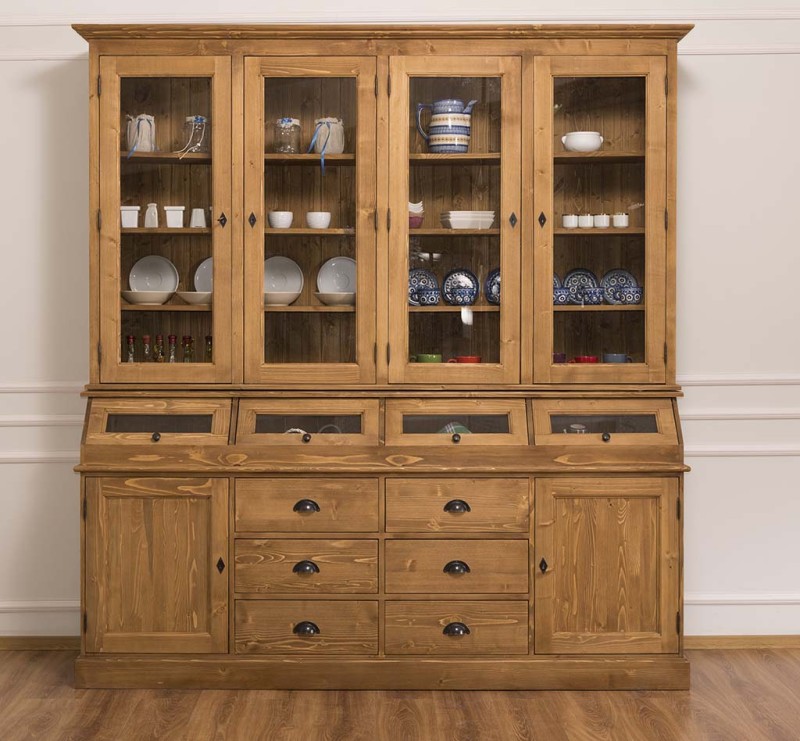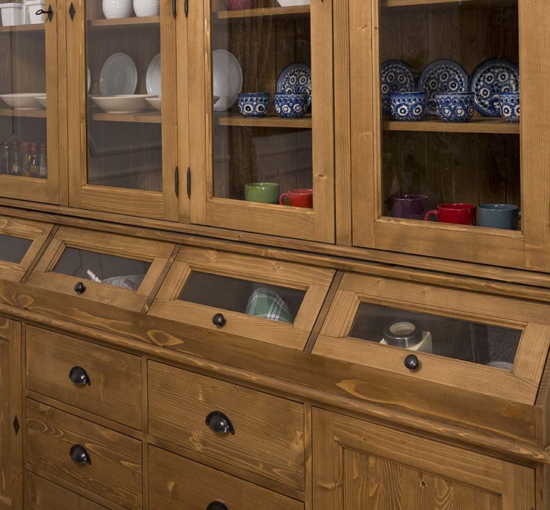 The product is part of the Kitchen Cabinets category and is made in Romania from 100% solid pine wood. The display case offers plenty of presentation space at the upper part behind four large glass doors, as well as generous storage space at the bottom part. The product is delivered mounted in two separate packages that only need to be placed on top of each other, and the very solid construction allows use for a very long time. They will thank you for their excellent quality and impressive design. Maintenance: It can be cleaned of dust and dirt with a slightly damp cloth. About the proper maintenance and use of the furniture, you can read more on the site, in the INFORMATION / Instructions for use section.